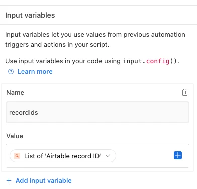 When you add the scripting action, you’ll need to pass a list of your recordIds (from the Find Records step) to your script via the Input Variables.